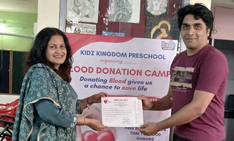 पुणे (प्रतिनिधि): ‘रक्तदान महादान’ मानवता का सबसे बड़ा प्रतीक है और यह किसी को नया जीवन दे सकता है, ऐसा प्रतिपादन किड्ज किंगडम प्री-प्रायमरी स्कूल की प्राचार्या वैभवी सोलंकी ने किया। वह महावीर जयंती के अवसर पर आयोजित रक्तदान शिविर के उद्घाटन समारोह में बोल रही थीं।